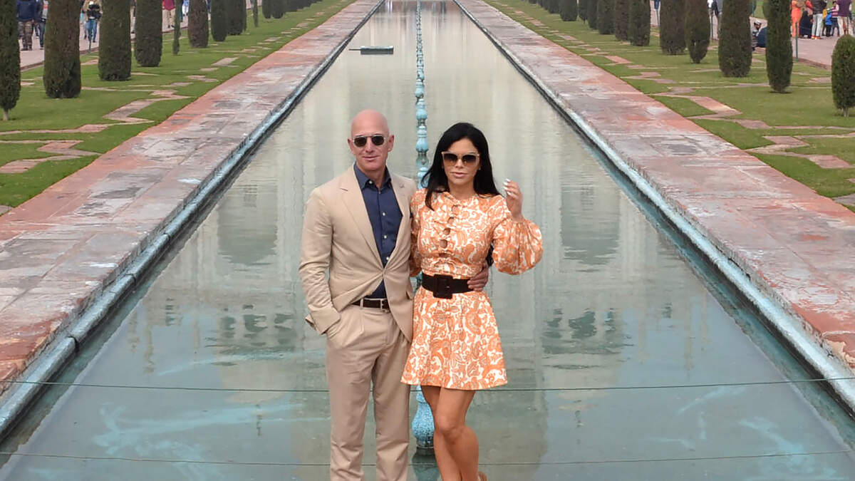 Photo: Chief Executive Officer of Amazon Jeff Bezos (L) and his girlfriend Lauren Sanchez pose for a picture during their visit at the Taj Mahal in Agra on January 21, 2020. (Photo by PAWAN SHARMA/AFP via Getty Images)